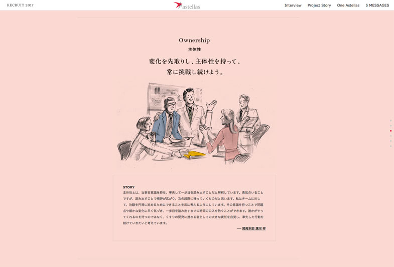 アステラス製薬のリクルート向け会社案内パンフレットとwebページ「5 MESSAGES」 と題された採用者向けメッセージ のイメージイラストを担当